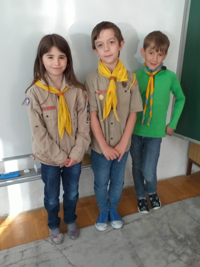 24.duben je mezinárodním svátkem skautek a skautů, který připadá na den svatého Jiří, patrona skautingu. Skauti a skautky si tento den připomínají odkaz odvahy a boje dobra proti zlu. Tento den se také slaví jako „Den v krojích“, kdy členové hnutí hrdě nosí skautský kroj nebo šátek na veřejnosti. Děkujeme Víťovi, Lucince a Jožkovi za seznámení s tímto svátkem a také za poutavé vyprávění o skautských zákonech a hodnotách.